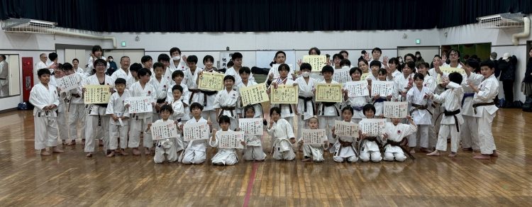 稽古の最後に 13日開催の昇段審査合格者の紹介・級証書の授与・9月段合格者の段証書授与・関東地区大会・四街道市民大会・流山親善大会出場者の紹介と結果報告をしました。